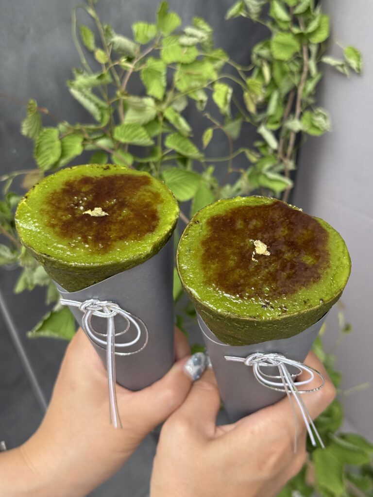 抹茶カスタードクリーム、くるみやホイップクリーム、苺のコンポートを抹茶を練り込んだ生地で包み込み、表面に砂糖をのせてキャラメリゼした人気クレープ。