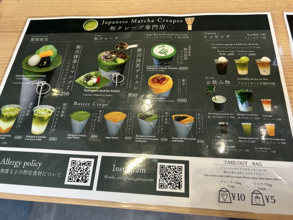 名物の掛川抹茶ブリュレクレープの他に、心斎橋店限定の抹茶ティラミスや季節限定クレープもありました。