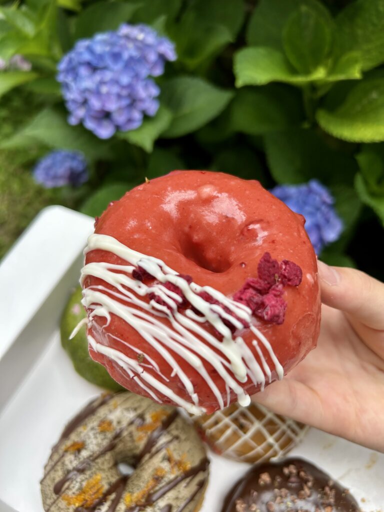 国産苺のフリーズドライパウダーをグレイズに使用、その上にラズベリーをトッピング、甘みと酸味が重なり苺づくしのドーナツ。