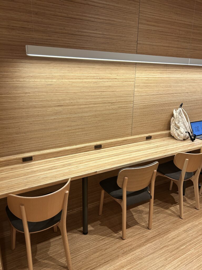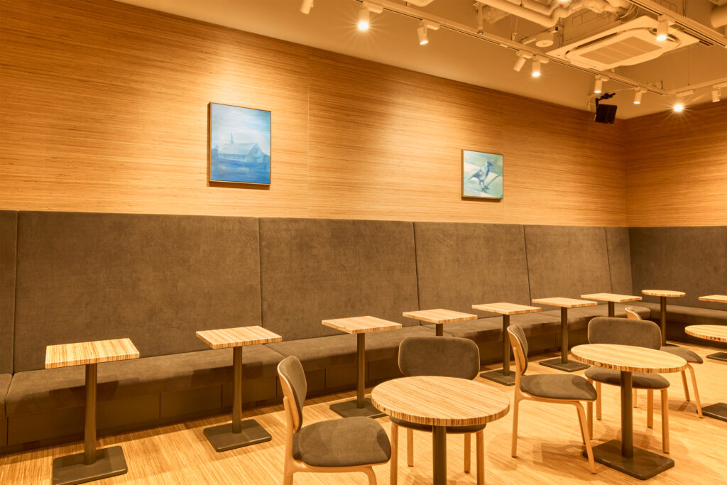 木のやわらかな雰囲気を取り入れ、素朴で優しい空間になっていて丸テーブルや電源完備のカウンター席がありました。