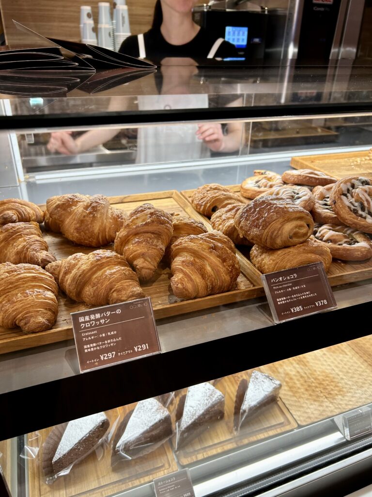 ショーケース内には、人気のクロワッサンやアップルパイの他に、ここ淀屋橋店限定のキーマカレーパイやタルトが並んでいます。