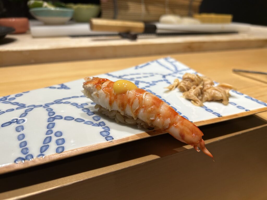 天草の車海老、まろやかながらさっぱりした黄身酢と共に味わえます。