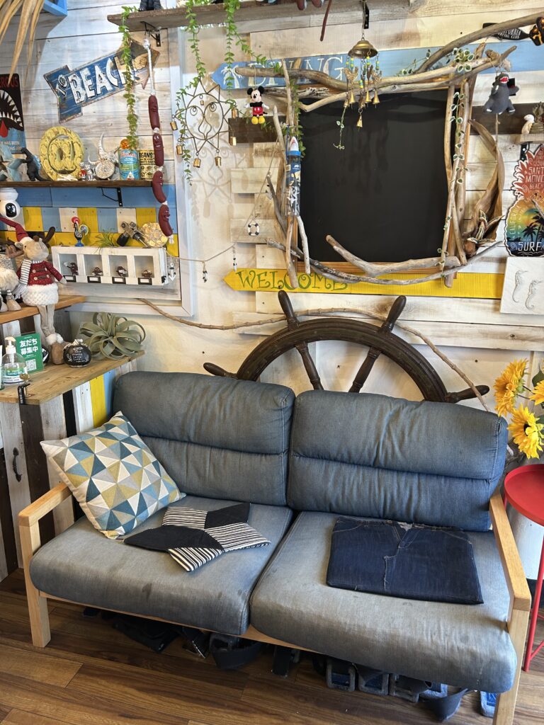 ハワイをイメージさせるような独特の店内でカウンター席やソファー席もあって店内でイートインも可能。