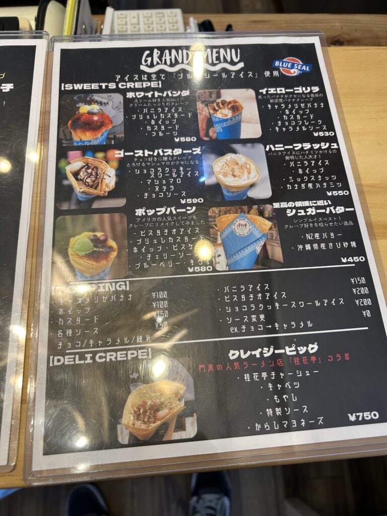 定番クレープは人気のブリュレクレープにホワイトパンダやハニーフラッシュなど面白いネーミング。