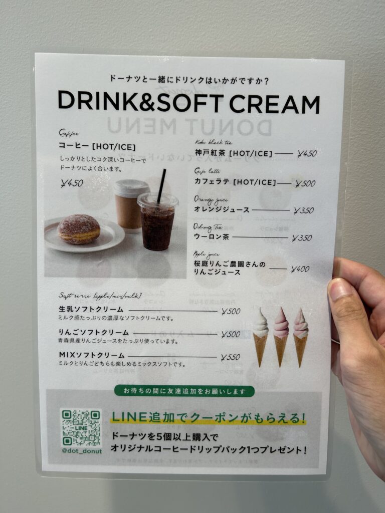 後ろにはイートインスペースがあって、ドーナツやドリンク、ソフトクリームを快適な環境で食べる事ができますよ。