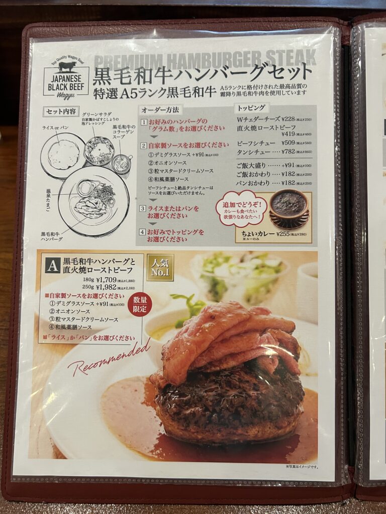 ハンバーグの量は180gか250gを選ぶ事ができ、大きい方が飛び出す肉汁の量が多いです。