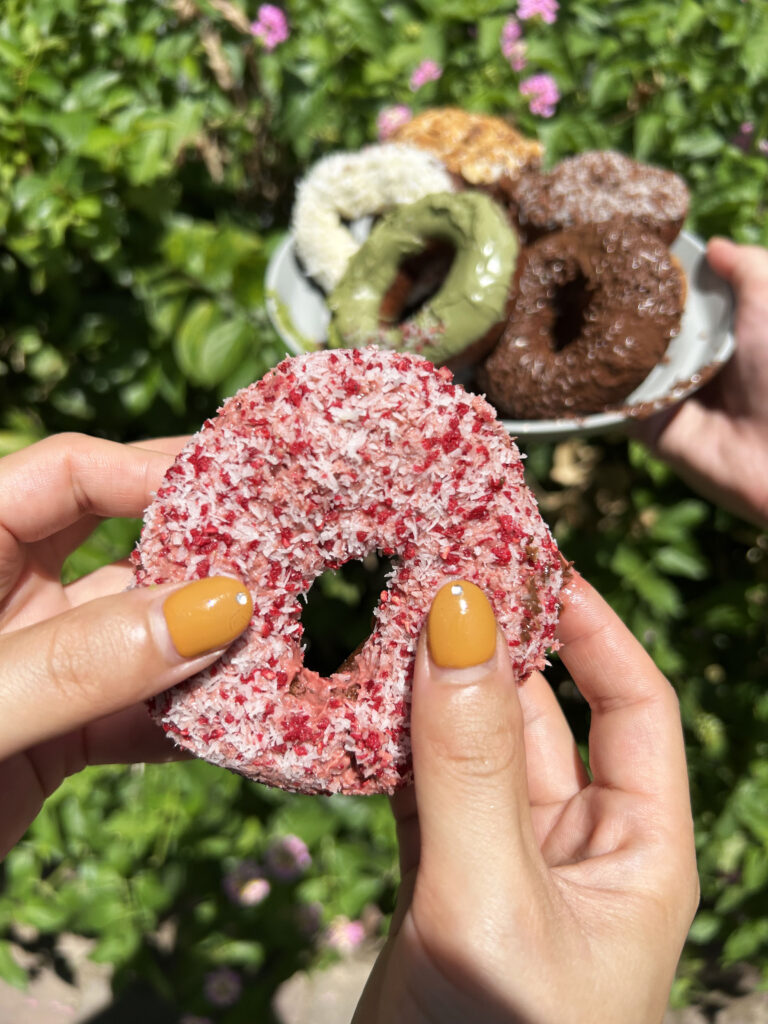 甘酸っぱいドライフルーツにココナッツチップとストロベリーチョコとともにデコレーションしたドーナツ。