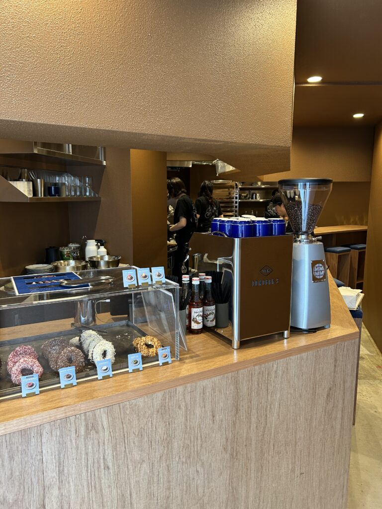 明るくスタイリッシュな店内で入口手前にドーナツが並んだショーケースがあり奥はイートインスペースとなっていました。