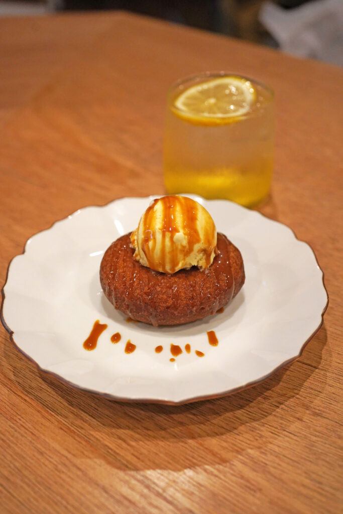 プレーンドーナツの上にバニラアイスそこにキャラメルソースをかけたイートイン限定ドーナツ。