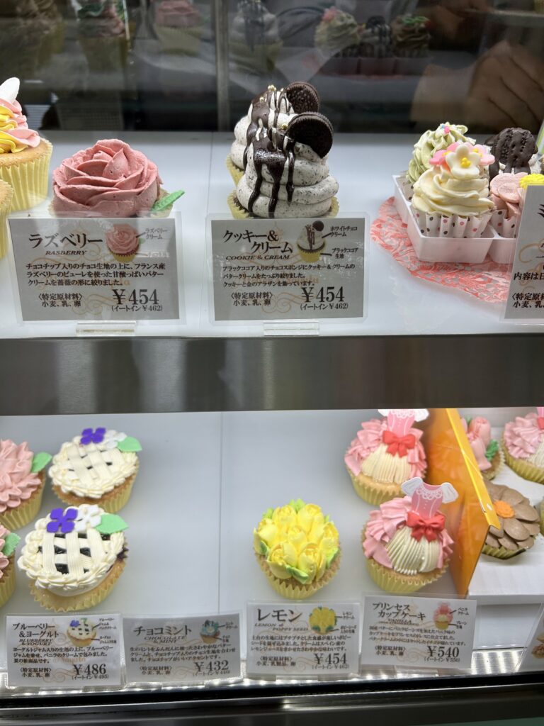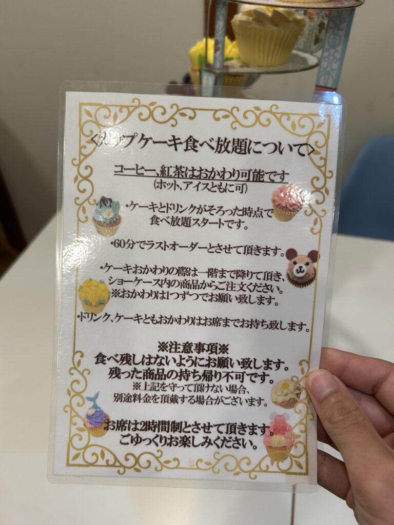 お店のインスタ投稿によると、「女性の方でもおひとり5~6個は召し上がられるようですので、例えばお二人で6個ずつをシェアしていただくと、ショーケース内の全12種のカップケーキをすべて味わっていただけます。」という食べ放題。