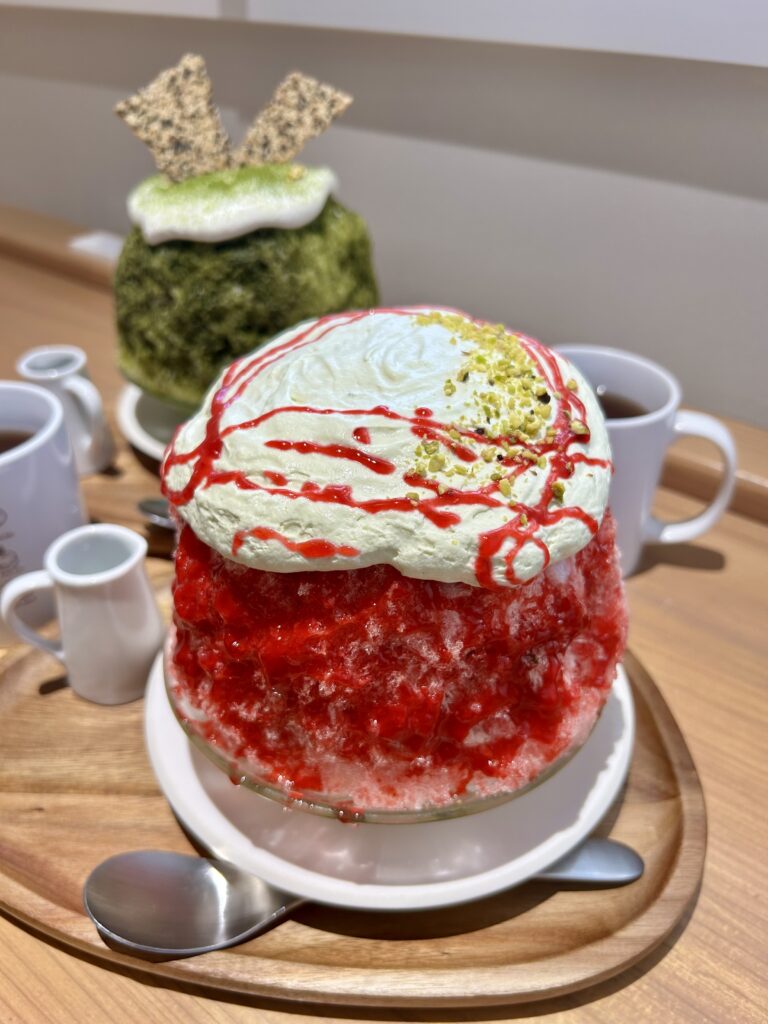 人気のピスタチオラズベリーに宇治抹茶の二種類のかき氷を注文。
