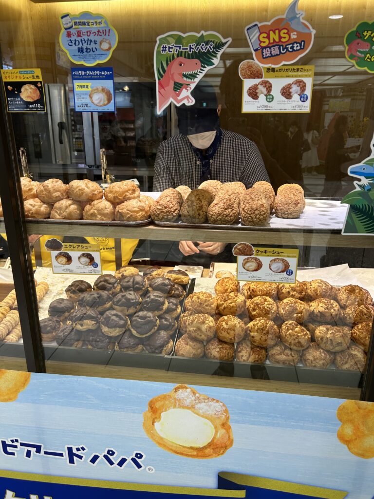 店頭にはパイシュークリーム、クッキーシューの他に期間限定の恐竜のガリガリシュー、ストロベリーチーズケーキやブルーベリーチーズケーキなどが並んでいました。