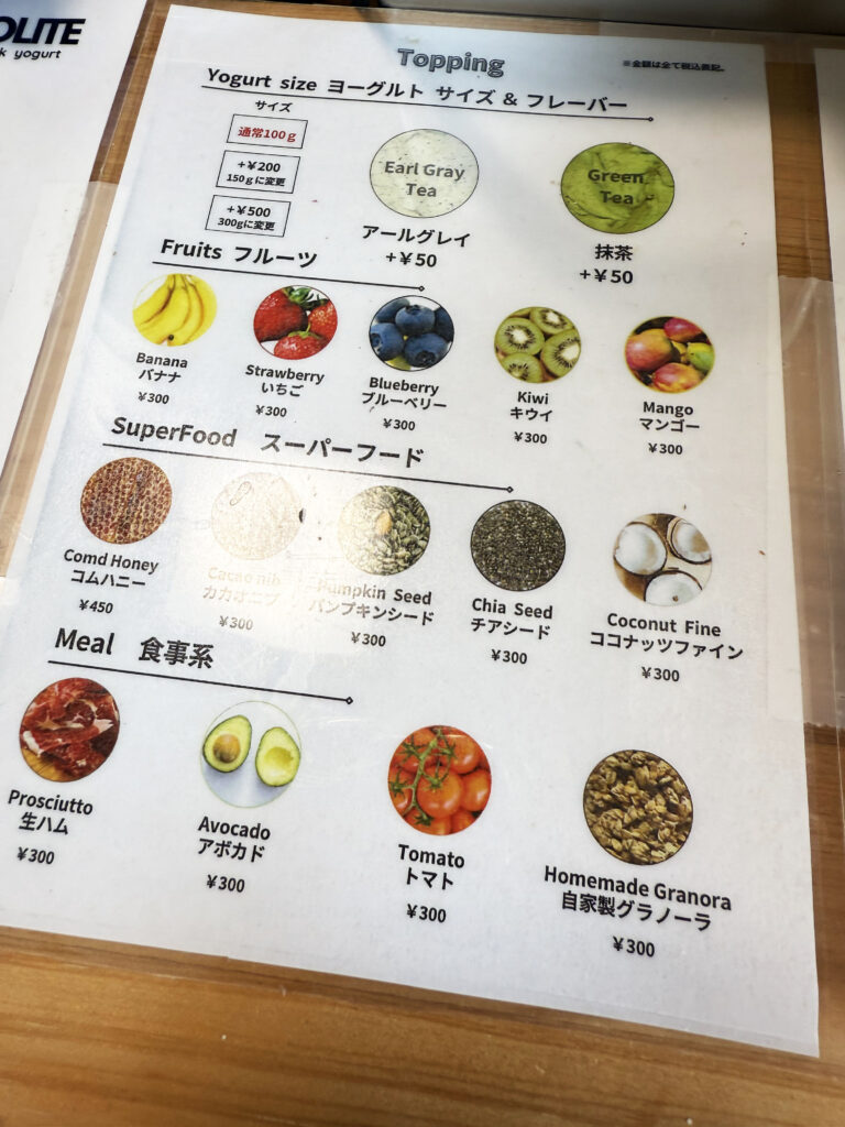追加トッピングは、グリークヨーグルト、フルーツ、コムハニーやカカオニブなどスーパーフードに生ハムやアボカドなどと食事系と豊富。