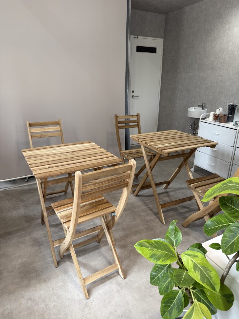 無機質な壁に植物、木製テーブル席とオシャレな店内でイートインできます。