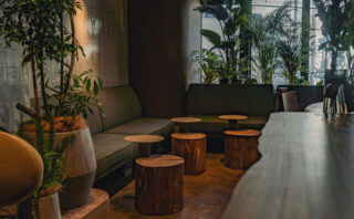 昼と夜で照明ひとつでまるで別空間に変わる内装になってて入口まで伸びた半円形のカウンターと、オリジナルの木でできたテーブルなどが特徴的。