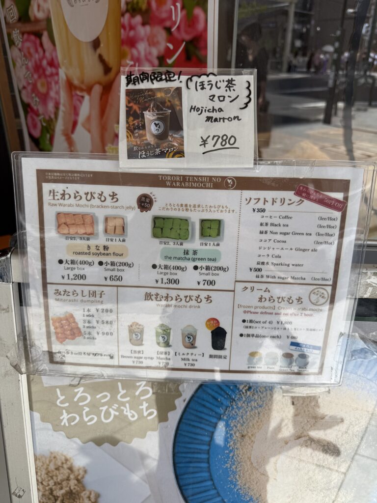 さらにみたらし団子や飲むわらび餅、ドリンクメニューがありましたよ。
