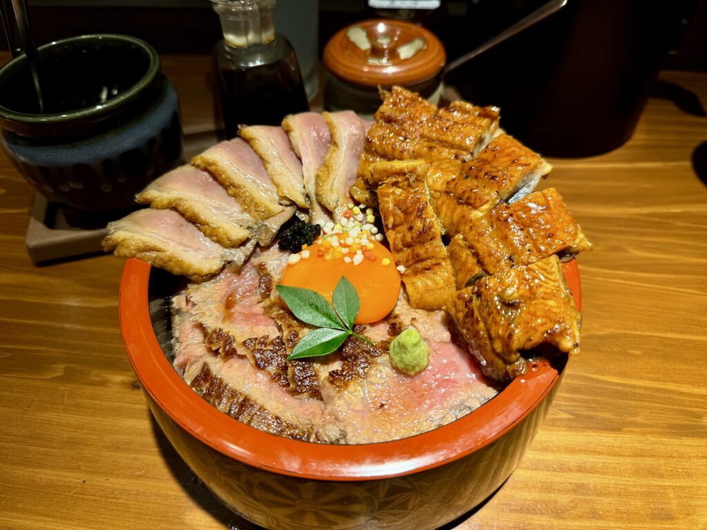 トッピングは炙り鰻、鴨ロースの並盛にしました。