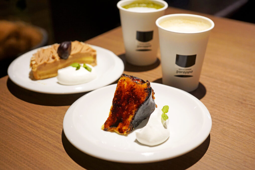 お目当てのブリュレバスクチーズケーキに、タルト、パンケーキそしてドリンクを注文。
