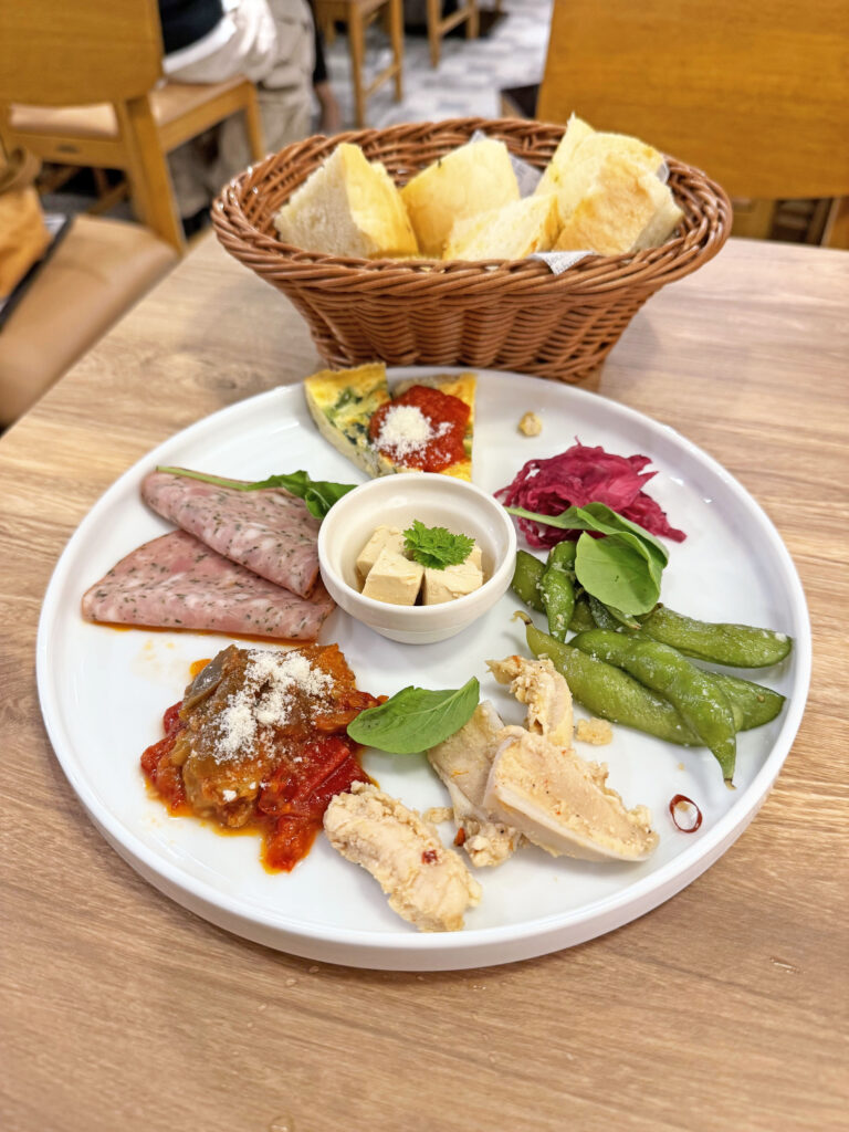 中央にクリームチーズ、枝豆ペペロンチーノ、サラミ、紫キャベツのマリネ、カポナータ、キッシュと色々なものを少量ずつ楽しめ前菜にぴったり。