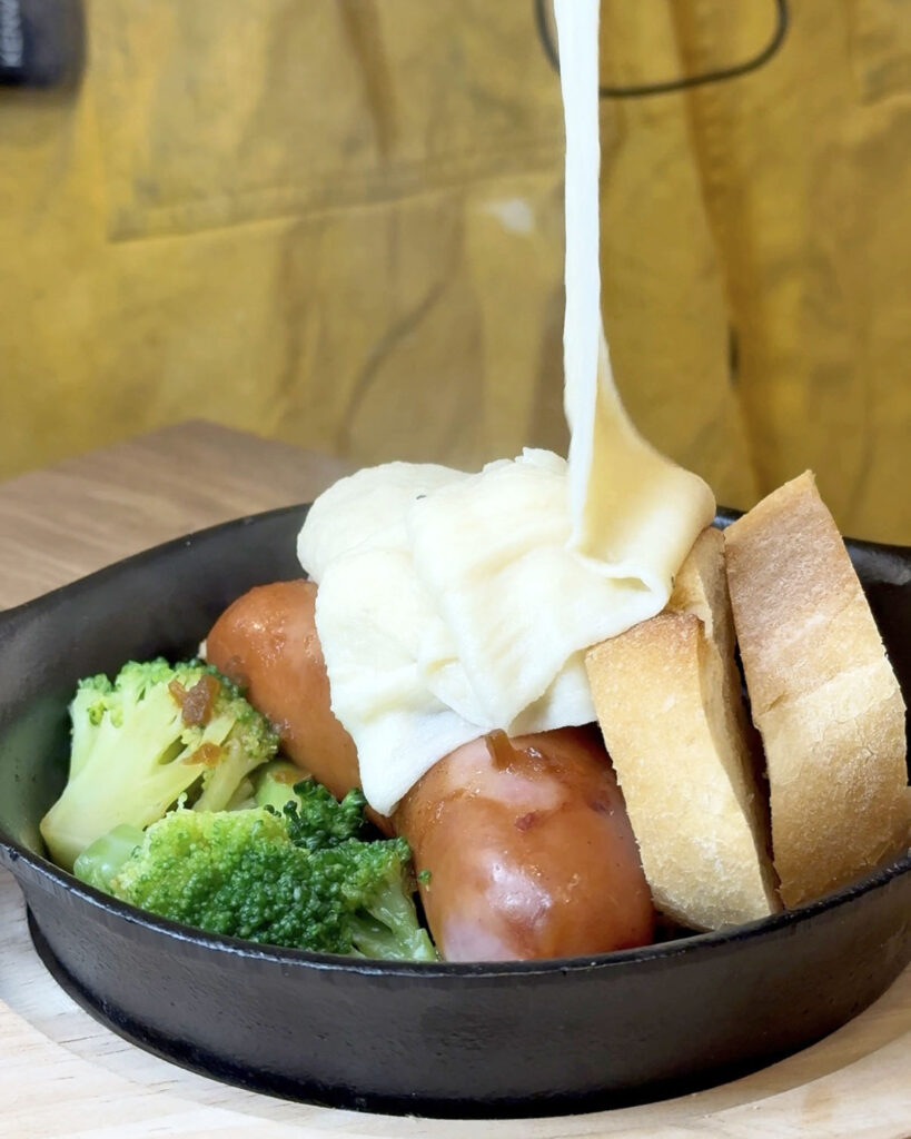 ソーセージ、ミニトマト、バゲット、ブロッコリーにスタッフさんが目の前でアリゴソース(じゃがいもにチーズを加えて作る濃厚なマッシュポテト)をかけてくださいます。