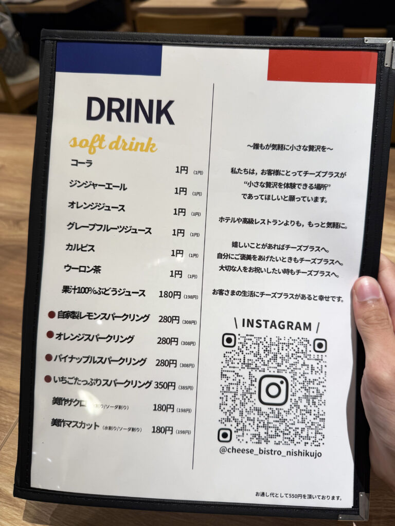 「原価ビストロチーズプラス 西九条」さんは、ソフトドリンクは1円~、アルコールは75円~で楽しめるチーズビストロ