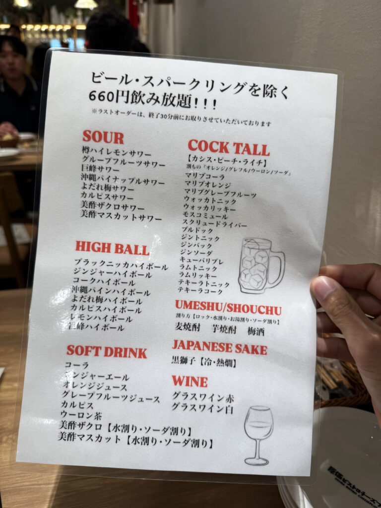 こちらはビール、スパークリングを除く飲み放題で660円。