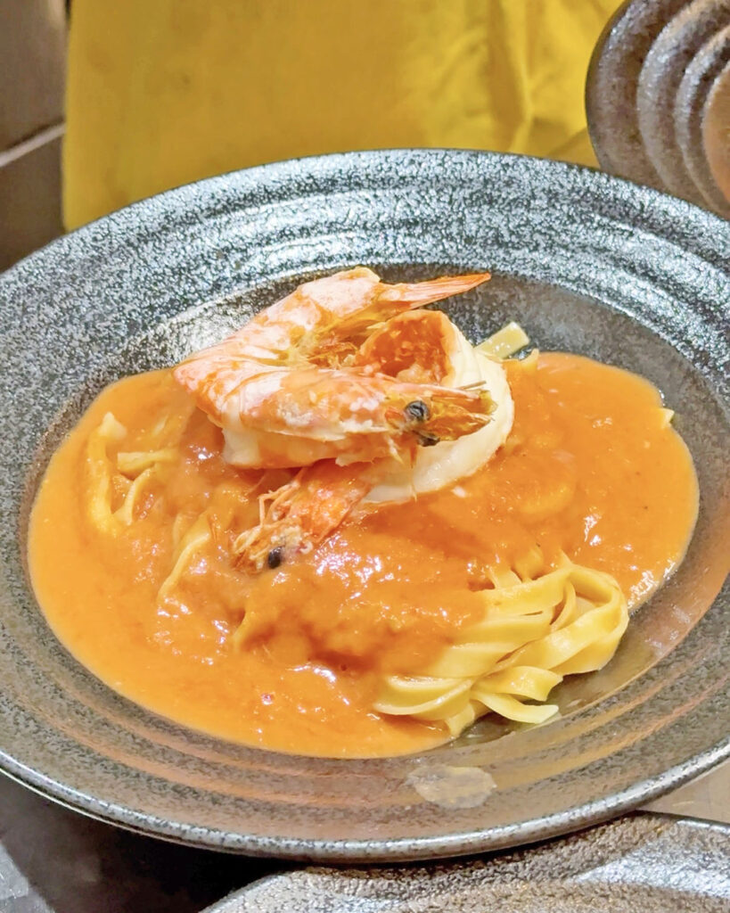 もちもちの平打ち麺に、海老の風味、まろやかながらトマトの酸味の効いたソースがよく絡まっていて海老好きにはたまらないパスタ。