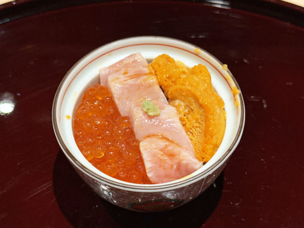 赤酢のシャリご飯の上に大トロ、ウニ、いくらがのった豪華な小丼。