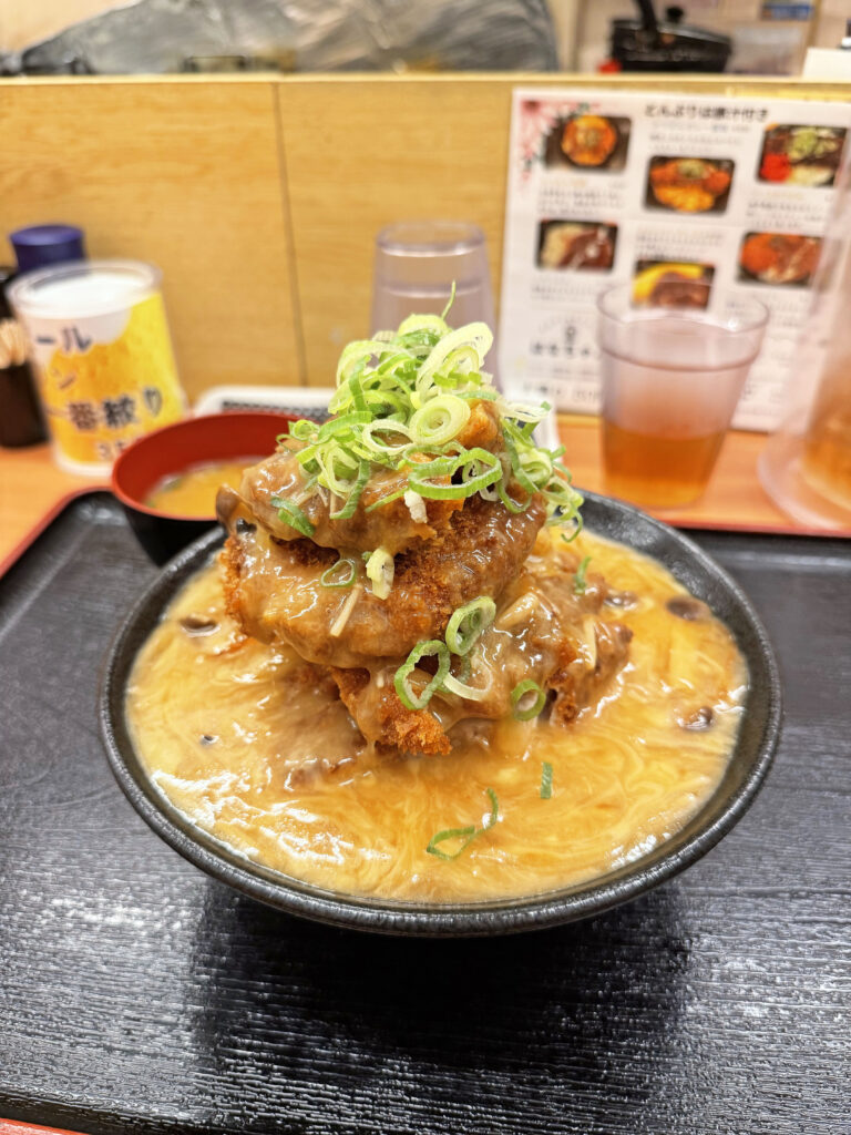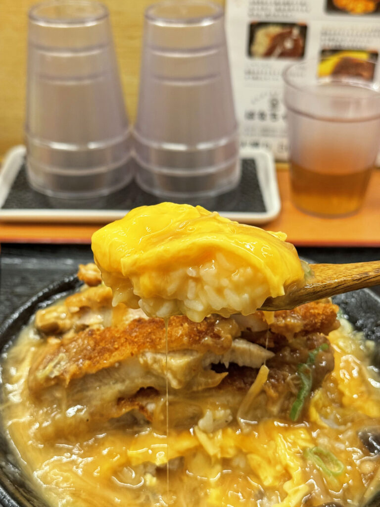 天津かつどんのカツを2枚、玉子2個そしてご飯を大盛りにしたメニューで、チーズをダブルで追加。