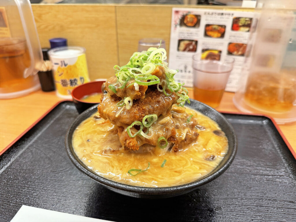 天津かつどんのカツを2枚、玉子2個そしてご飯を大盛りにしたメニューで、チーズをダブルで追加。