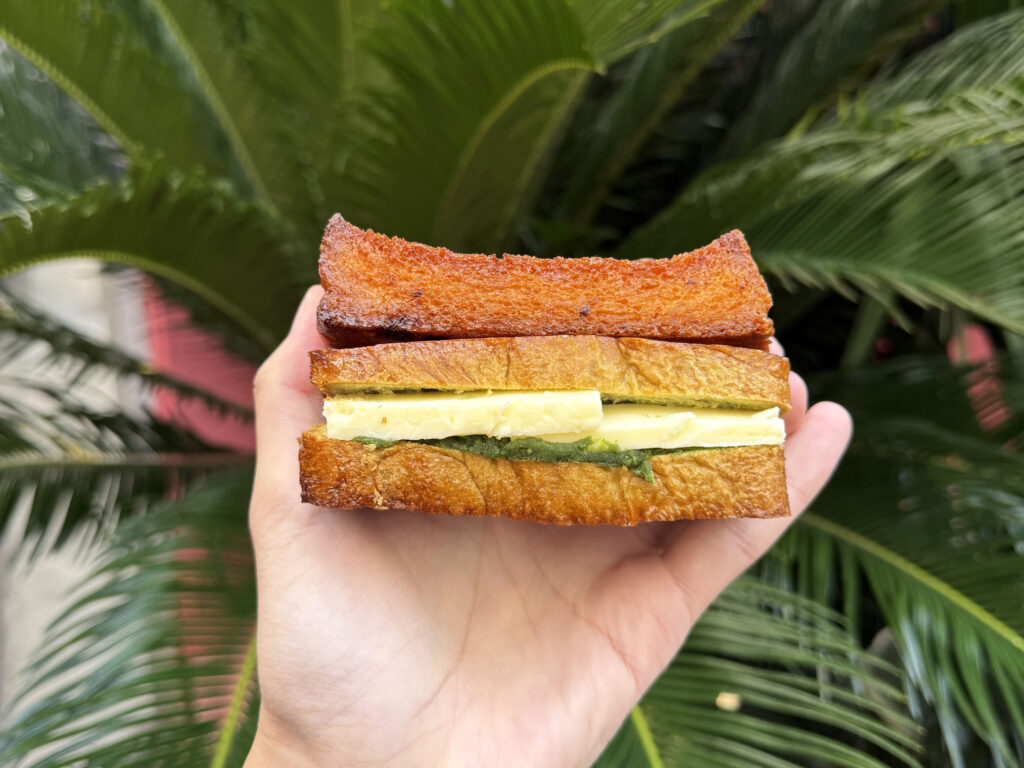 ”極美”ナチュラル食パンに、蜂蜜と北海道産バターで作るハニーバターをたっぷり染み込ませ、砂糖をまぶしてオーブンで香ばしくキャラメリゼした抹茶ハニートーストに、宇治抹茶を使用した濃厚こし餡と有塩バターをサンド。