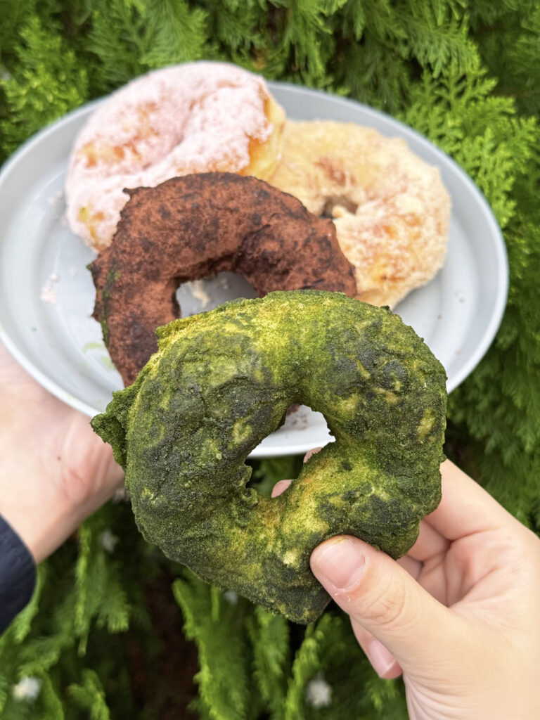 「若竹」という品種の宇治抹茶をふんだんにふりかけた台湾ドーナツ。