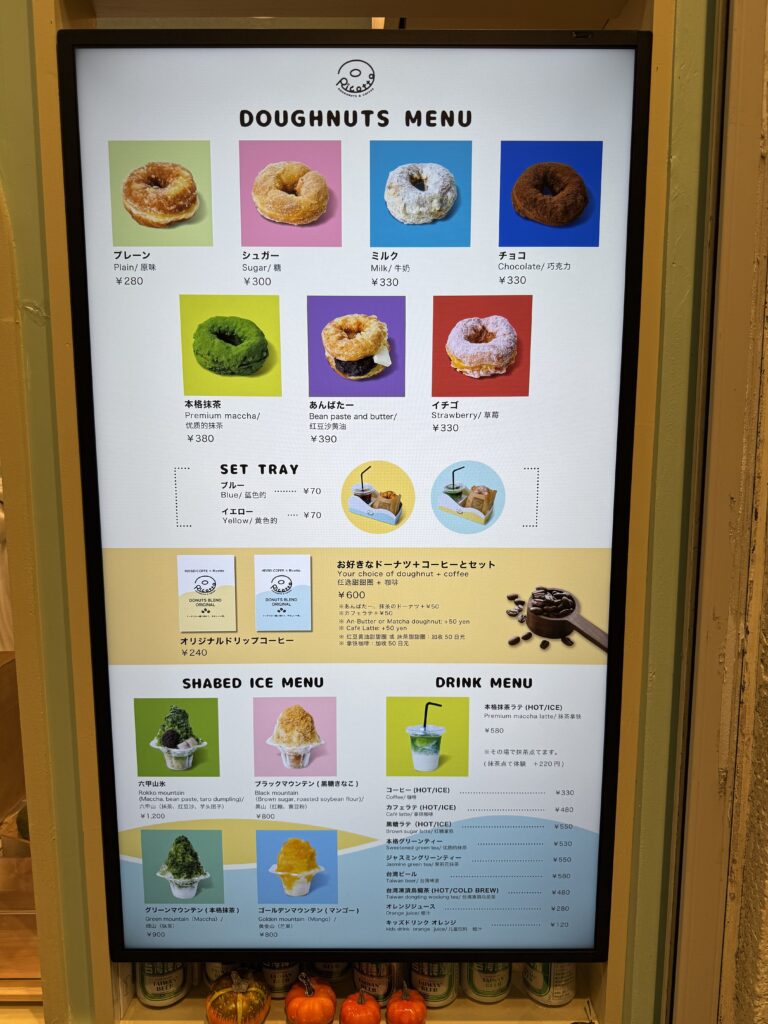 ドリンクは抹茶ラテにコーヒー、グリーンティー、黒糖ラテ、ソフトドリンクとたくさん。