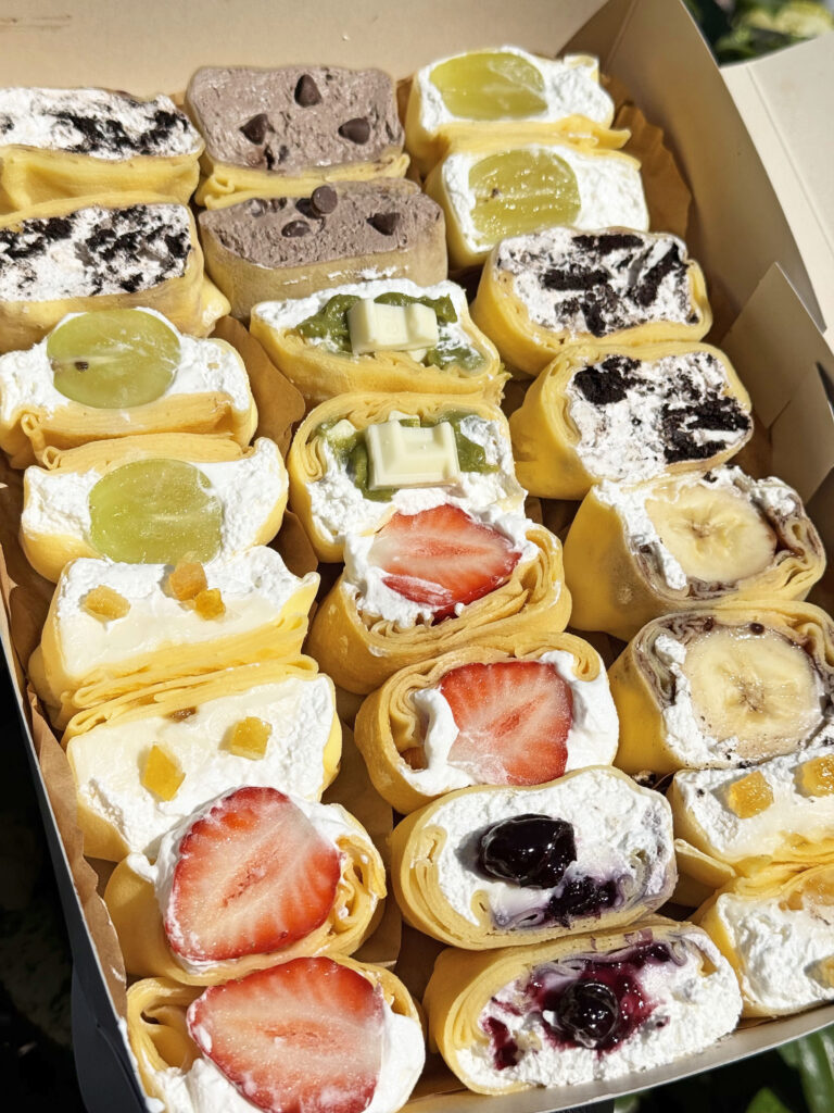 柔らかいクレープ生地の中にはみずみずしい苺やシャインマスカットに、酸味の効いたレアチーズクリームやチョコクリームなどがたっぷり。