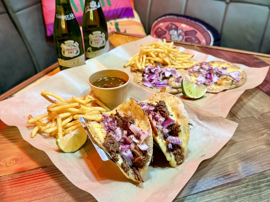 人気のチーズビーフビリアとシュリンプタコスをシェア。