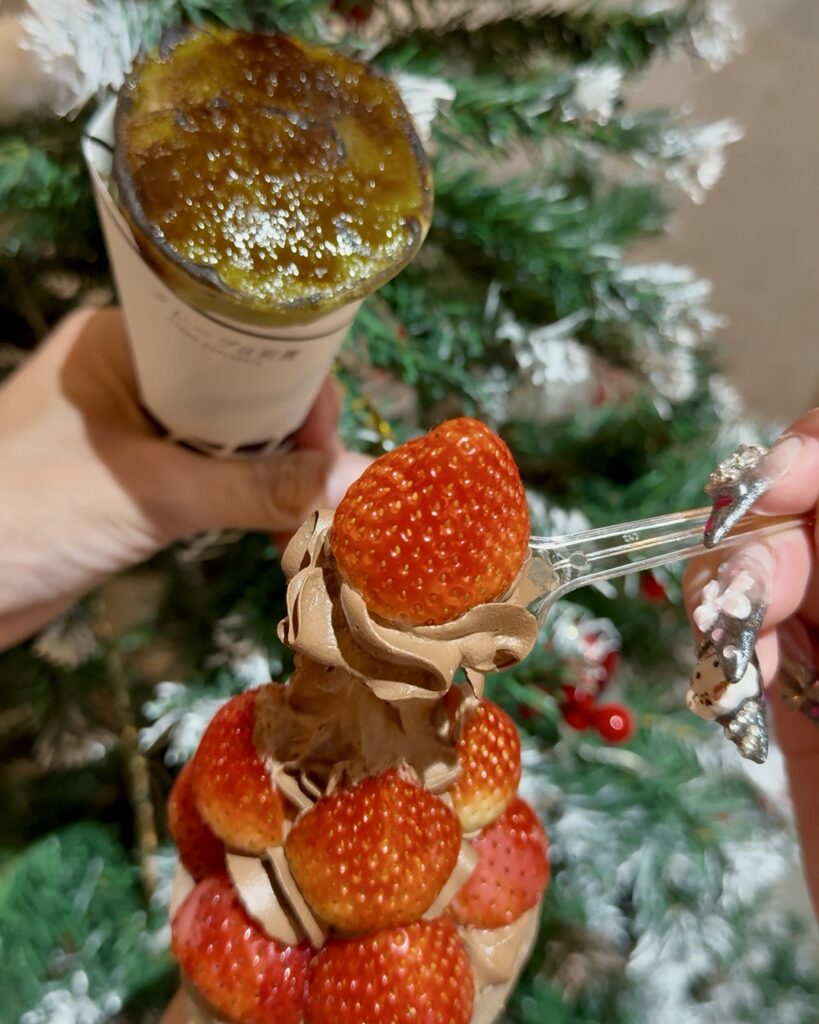 濃厚なチョコレートソース、チョコカスタード、そしてサクサクのチョコクランチといちごの甘酸っぱさがマッチ。