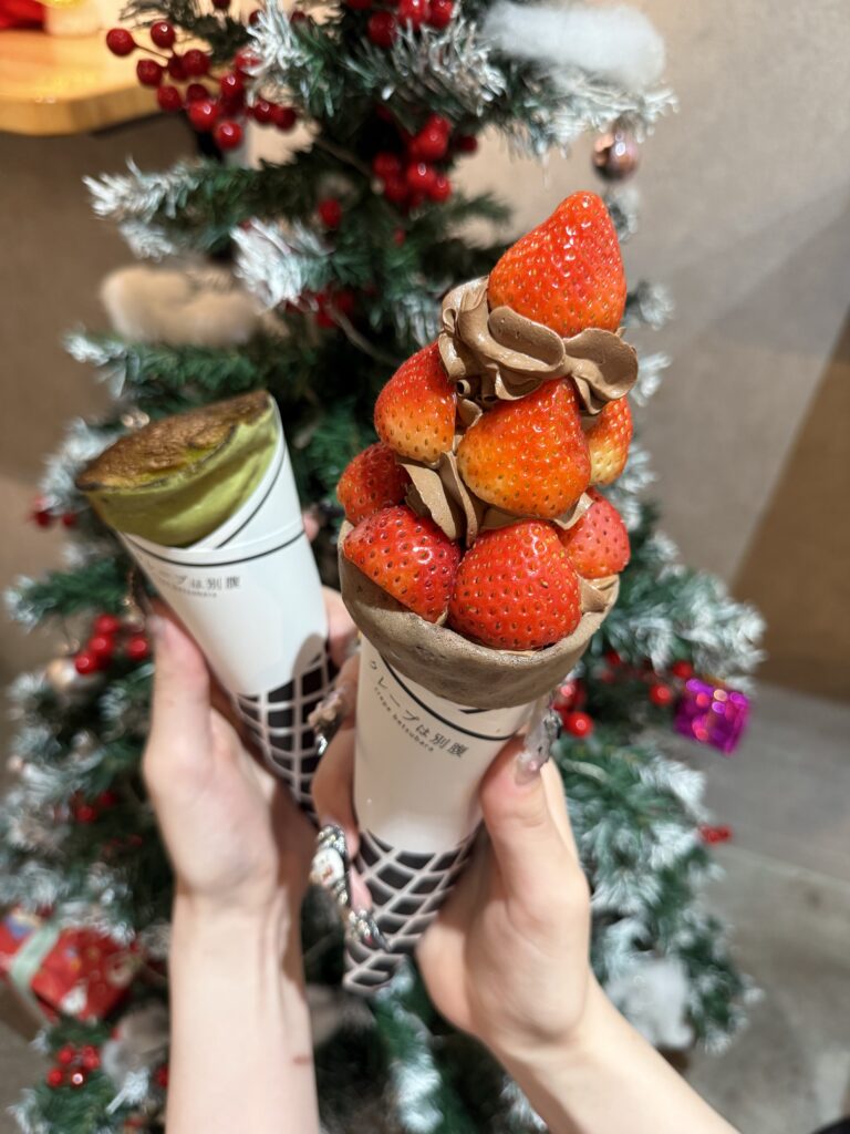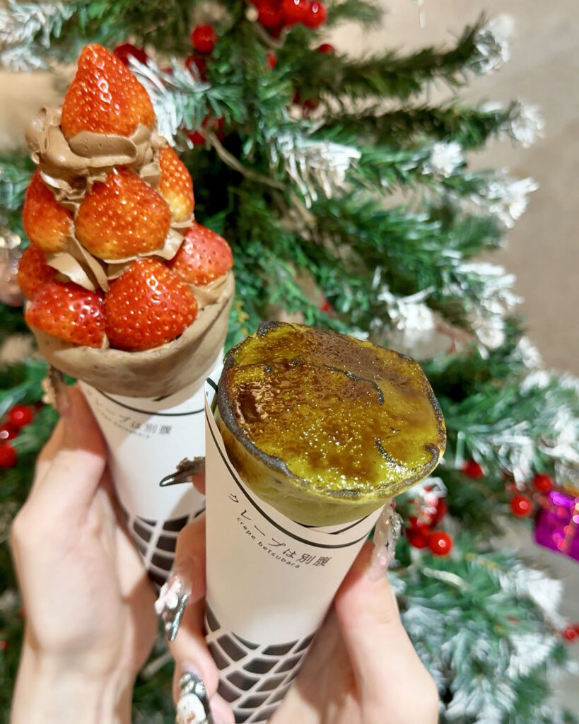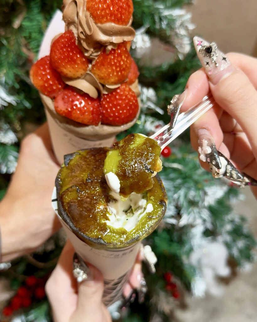 目を惹く苺のショコラ生地クレープに抹茶ブリュレクレープを注文。