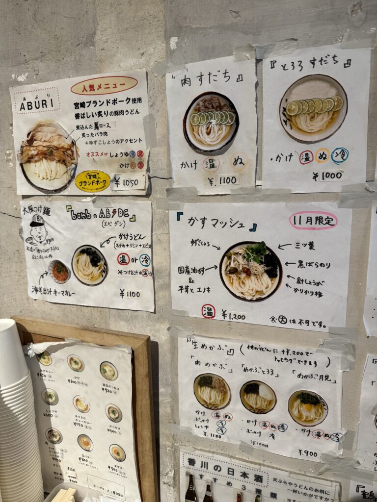 うどんは人気の「ABURI」に、限定の油かす、すだち、明太子、キムチなど他のうどん専門店では見かけないものが多かったです。