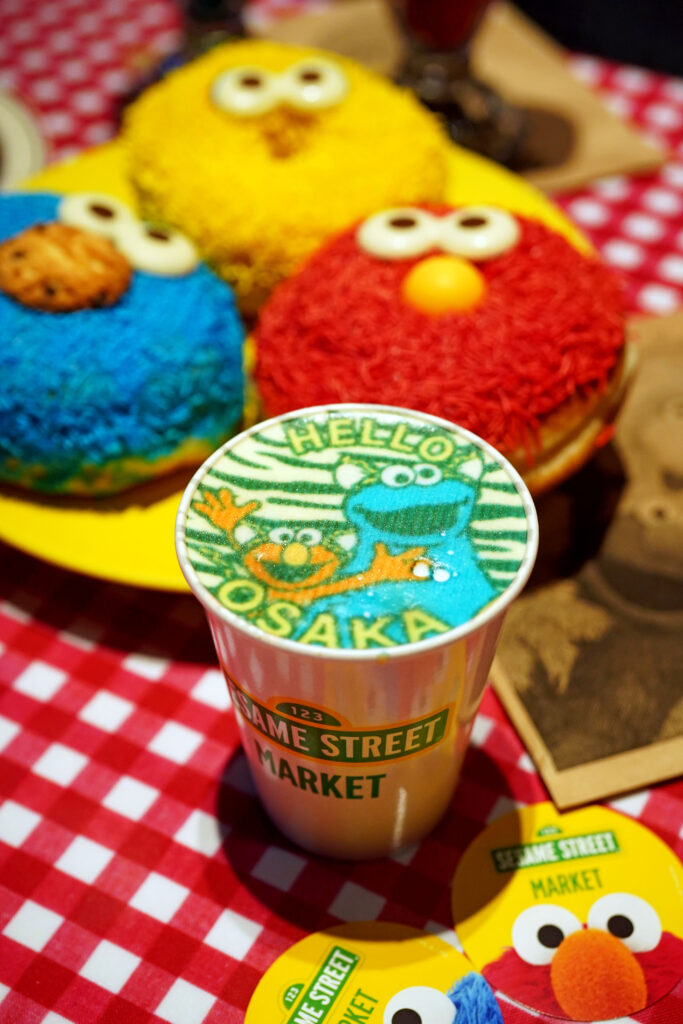 “HELLO, OSAKA”の文字とともに、大阪ならではのトラのコスチューム姿になったエルモとクッキーモンスターをポップなイラストで描いた、見た目にも楽しい一杯。