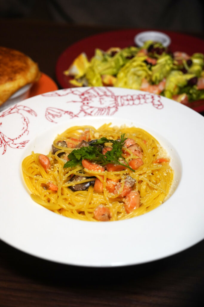 サーモンの旨みとポルチーニの芳醇な香りを濃厚クリームに重ねた贅沢カルボナーラ。