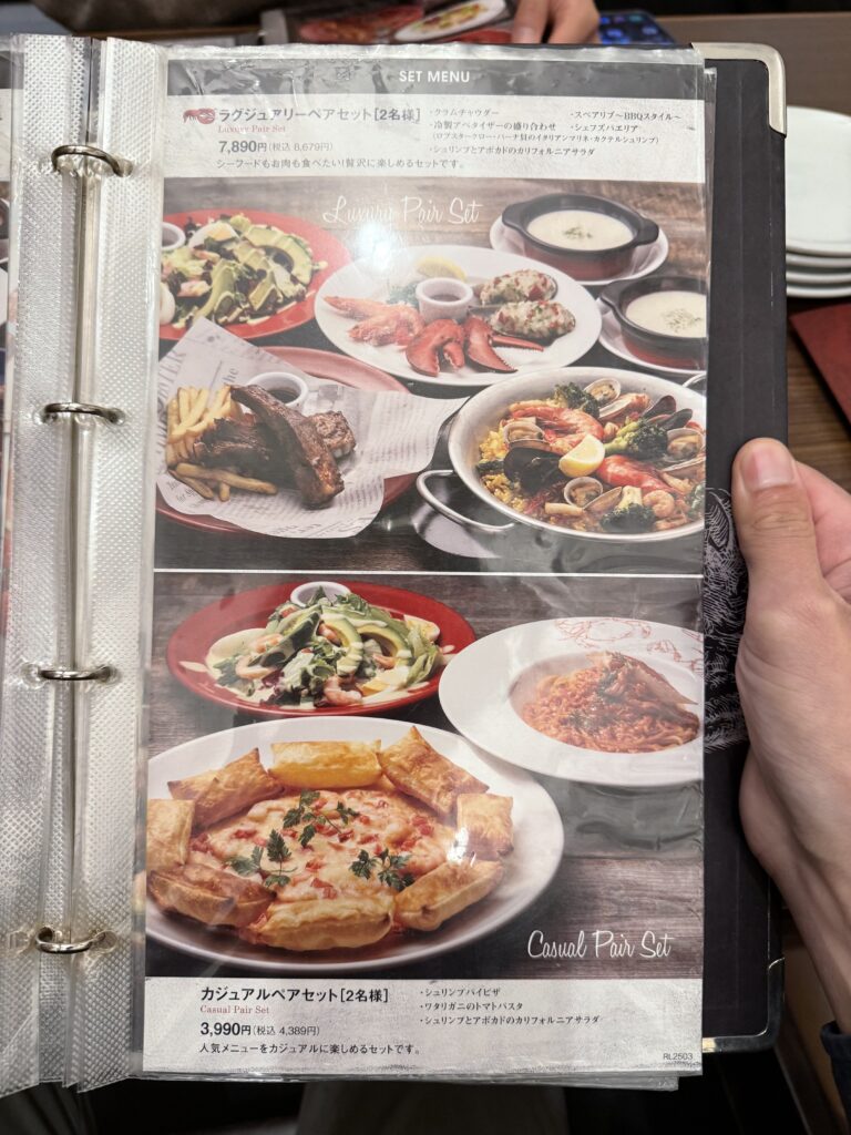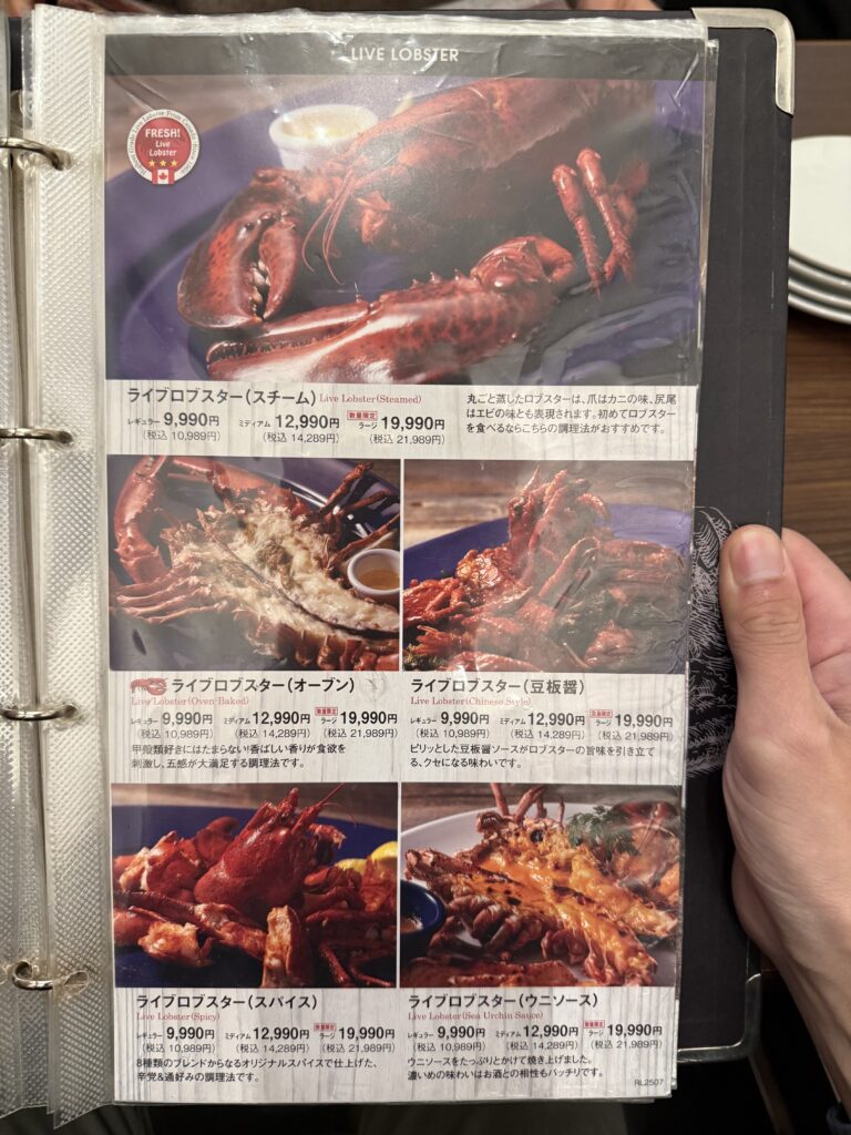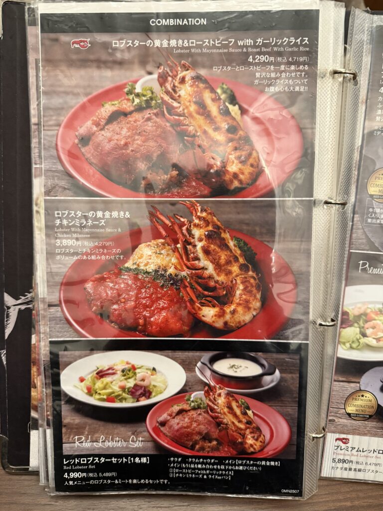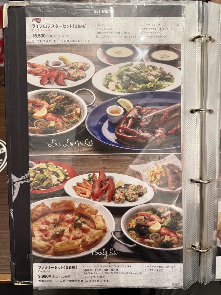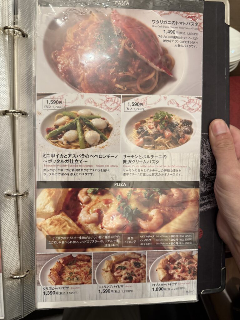 ロブスターにパスタ、ピザなどいろんなメニューが組み込まれています。