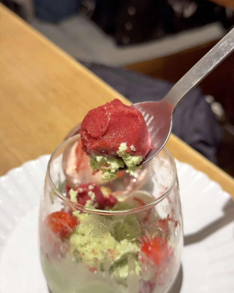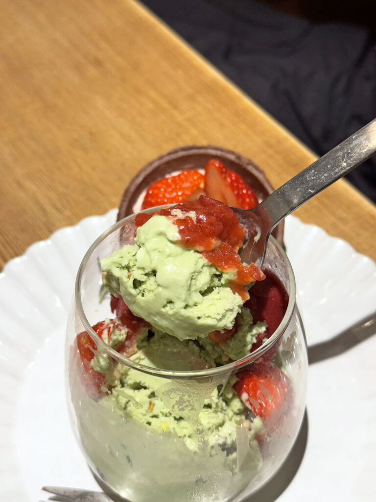 パフェは、濃厚なピスタチオのアイスにもちもちの白玉、ぷるぷるの豆乳プリン。