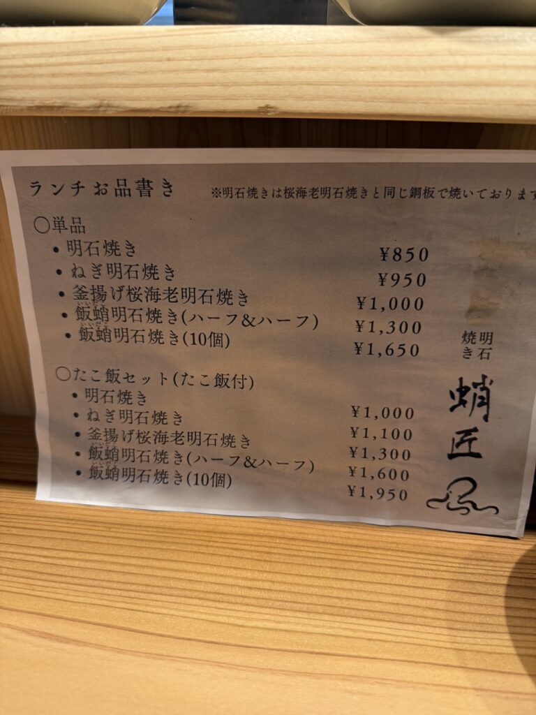 ランチメニューは単品明石焼きに、たこ飯がついた定食もありました。