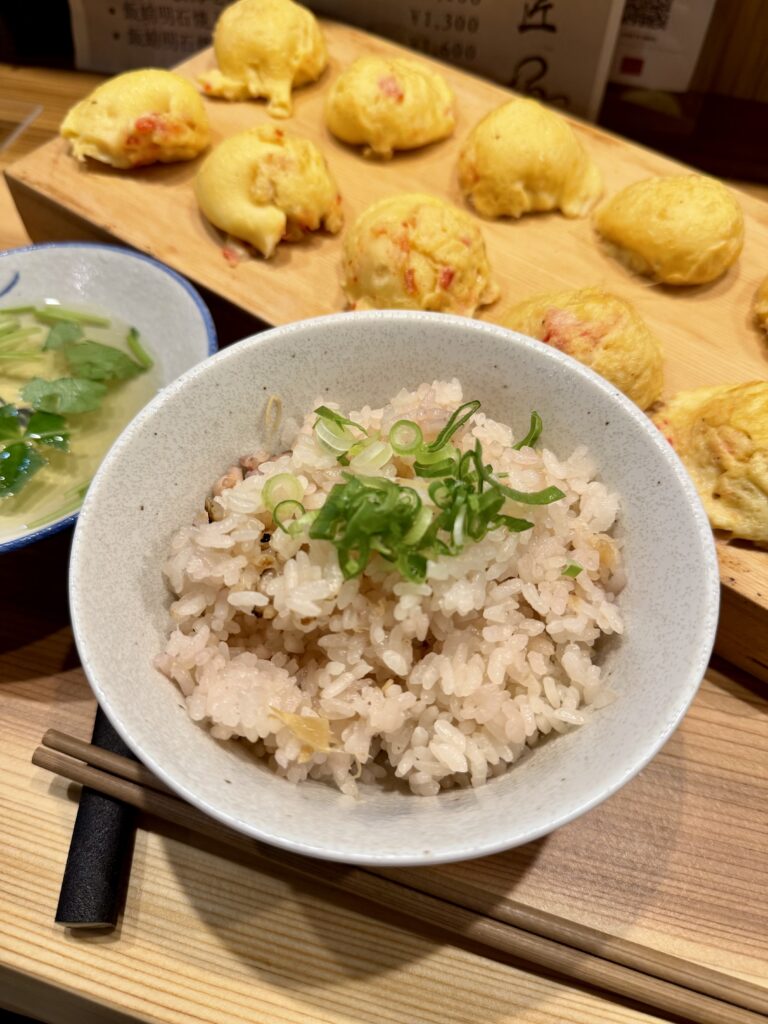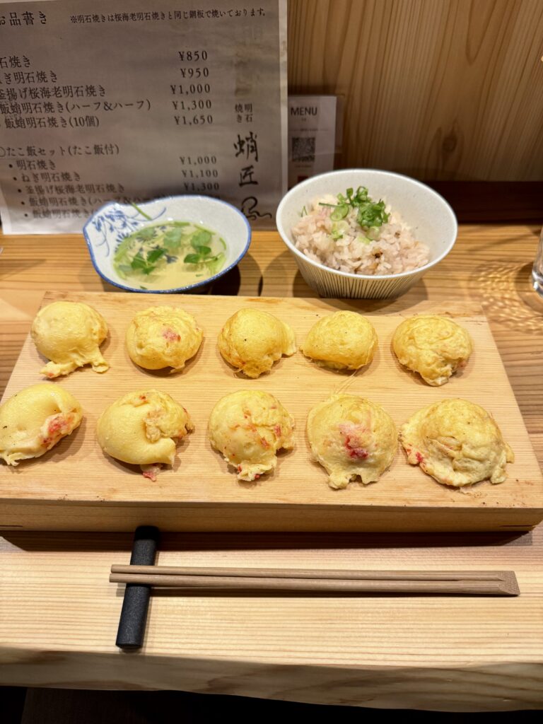 釜揚げ桜海老明石焼きに、出汁そしてたこ飯がセット。