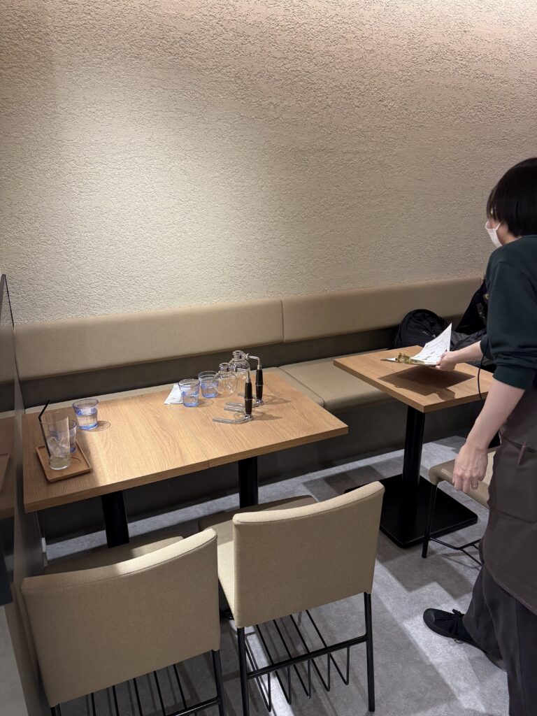 木目を基調とした落ち着いた空間で、1階と2階にテーブル席やカウンター席があります。