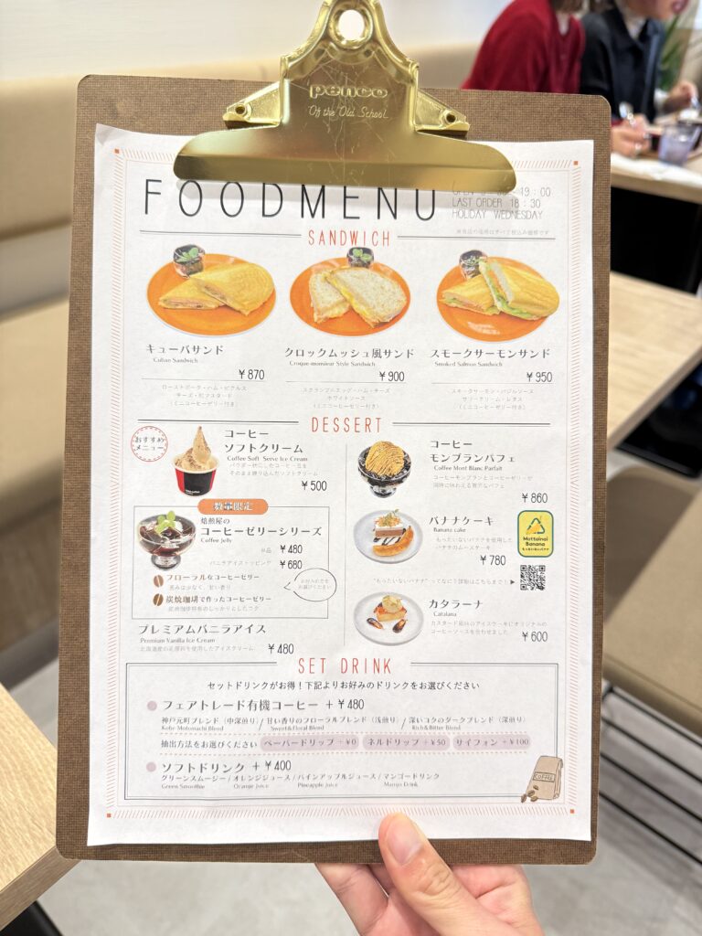 フードメニューはキューバサンドやクロックムッシュなどのサンドイッチに、コーヒーソフトクリームやバナナケーキなどのスイーツがあり、プラスでドリンクをつける事ができますよ。