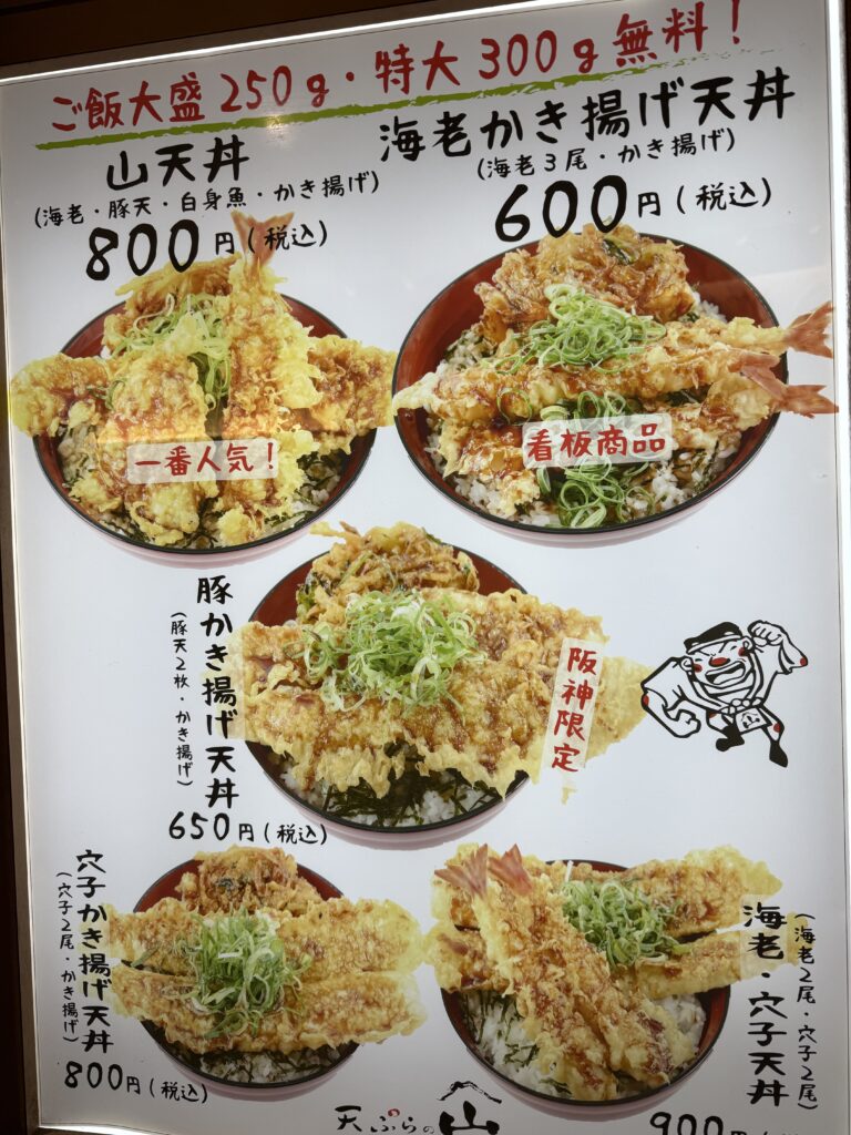 「天ぷらの山 梅田阪神店」さんはフードコート内のリーズナブル天丼が味わえるお店