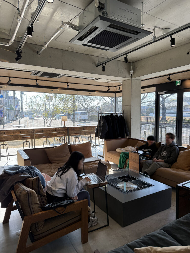 シェアオフィス、コリビングハウス、カフェ、ギャラリーが融合した複合ビルディングの1階。