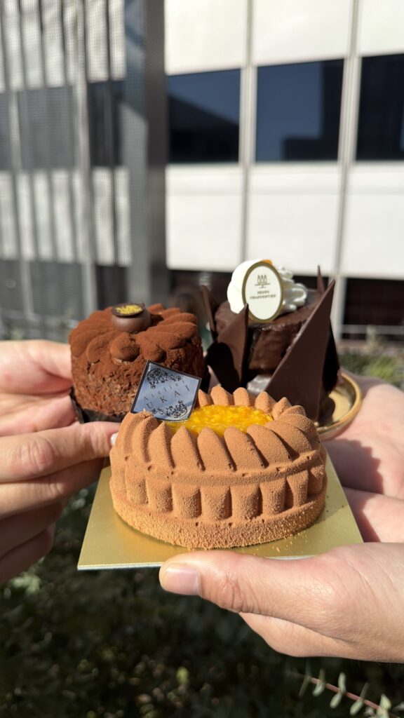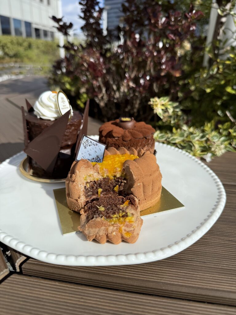 ペルー産ミルクチョコムースと、マダガスカル産カカオマスのダークチョコムースを重ね、南濃みかんの自家製コンフィチュールとアーモンド入りカカオ生地を合わせたケーキ。