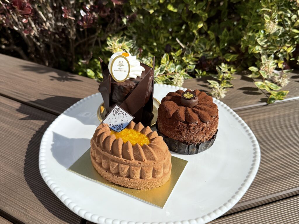 ペルー産ミルクチョコムースと、マダガスカル産カカオマスのダークチョコムースを重ね、南濃みかんの自家製コンフィチュールとアーモンド入りカカオ生地を合わせたケーキ。
